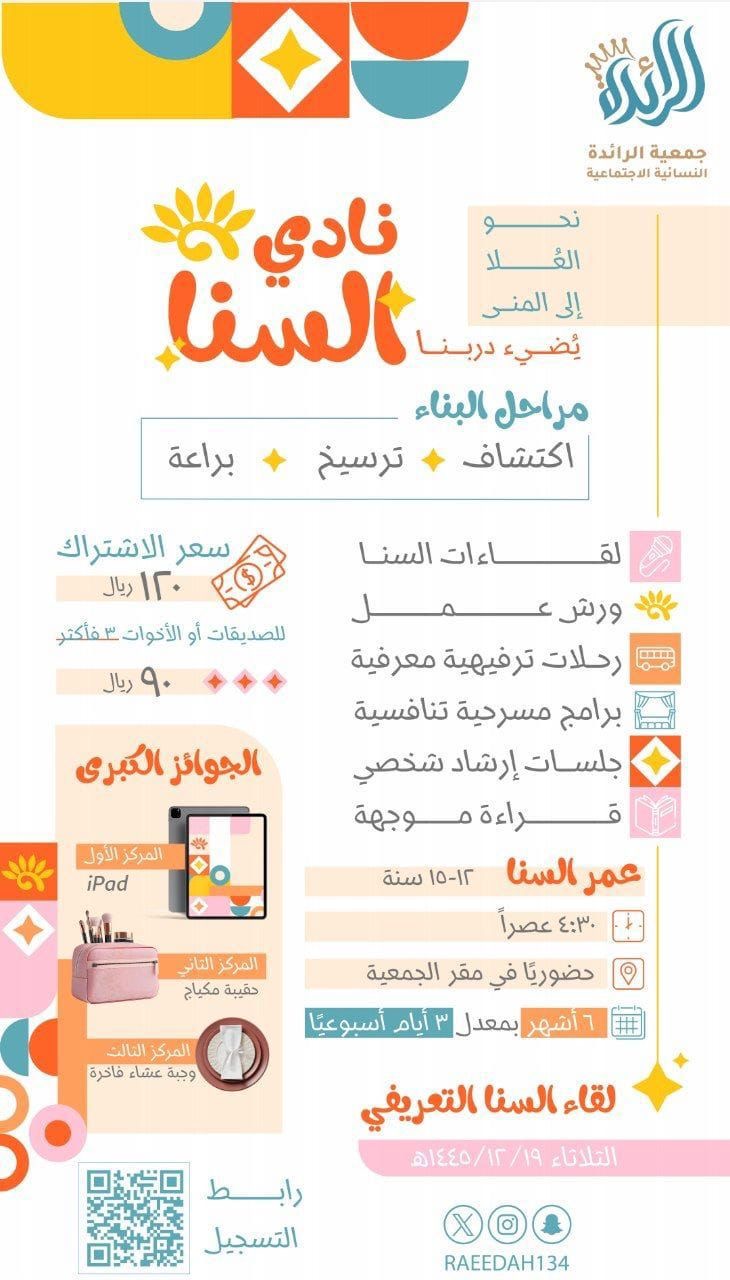 مشروع قيمي مهاري ترفيهي يستهدف فتيات المرحلة المتوسطة من (١٣-١٦) يعمل فيه متخصصات في برامج الفتيات. يتسم بتسلسله في مراقي ترتقي فيها الفتيات من مرحلة لأخرى لتحقيق التنافس بين الفتيات. وتعزيز سلوك التغيير وقيمة تزكية النفس، ويركز على اكساب المهارة وغرس القيم وتعديل السلوك من خلال أنشطة مهارية وترفيهية آمن وجاذب يراعي القيم تعمل فيها الفئة المستهدفة وتشارك بنفسها في تقديم البرامج والأنشطة لتكتسب من خلالها الثقة الذاتية ويتم ملاحظة سلوكيتها وتوجيهها أثناء ممارسة تلك الأنشطة ومن ثم توجيهها من خلال مشرفات البرنامج.