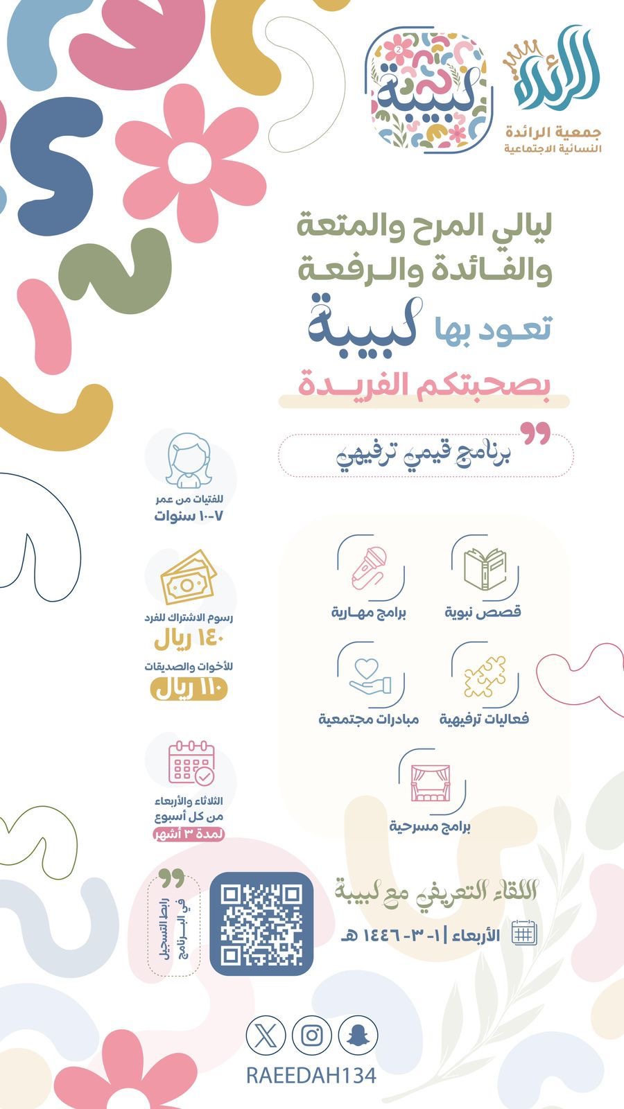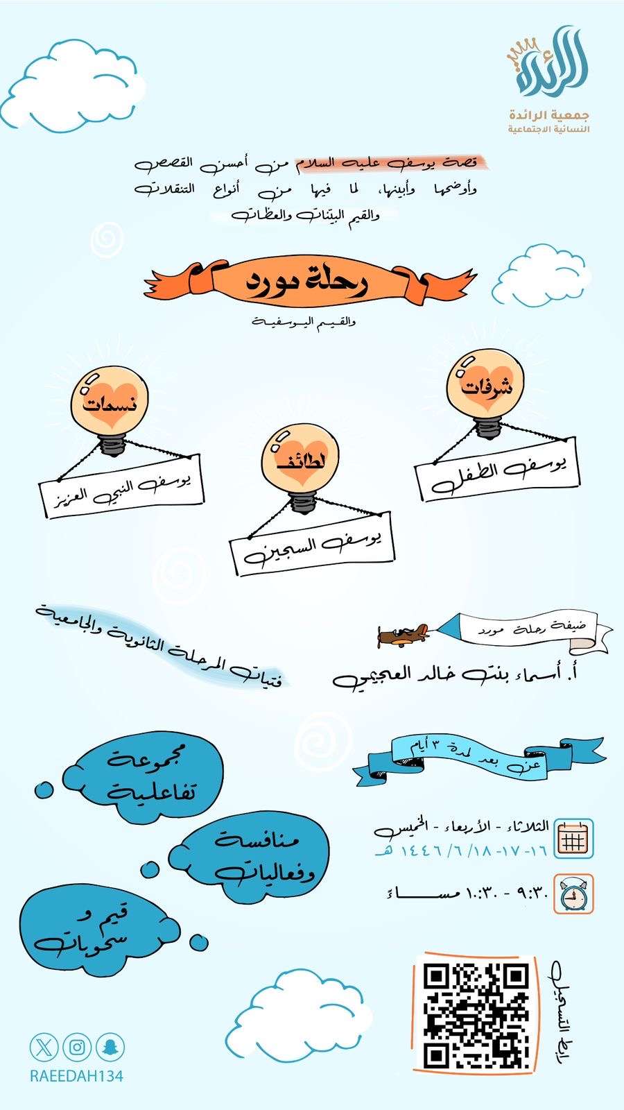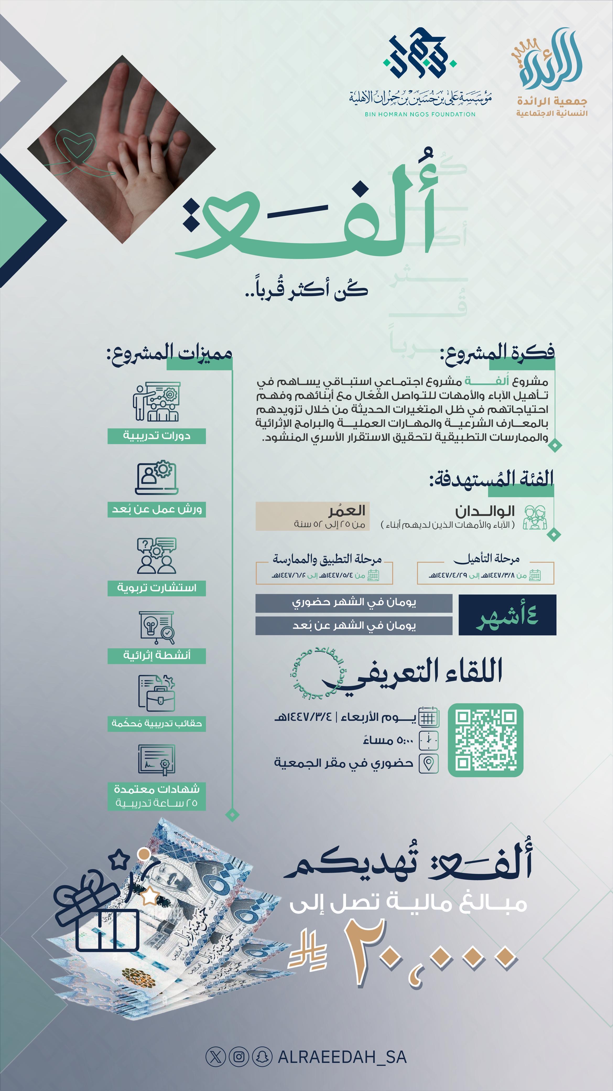 مشروع قيمي اجتماعي مهاري يستهدف فتيات المرحلة الثانوية والجامعية من خلال تفعيل الجانب العلمي والعملي. وورش التأهيل النفسي والسلوك والمهاري، تقدمها كفاءات متخصصة لتصل بالفتاة إلى مرحلة تحقيق الاتزان النفسي والرصانة الفكرية. والارتقاء السلوكي وتقديم النفع المجتمعي من خلال المشاريع الجماعية والفردية في بيئة جاذبة وفاعلة.