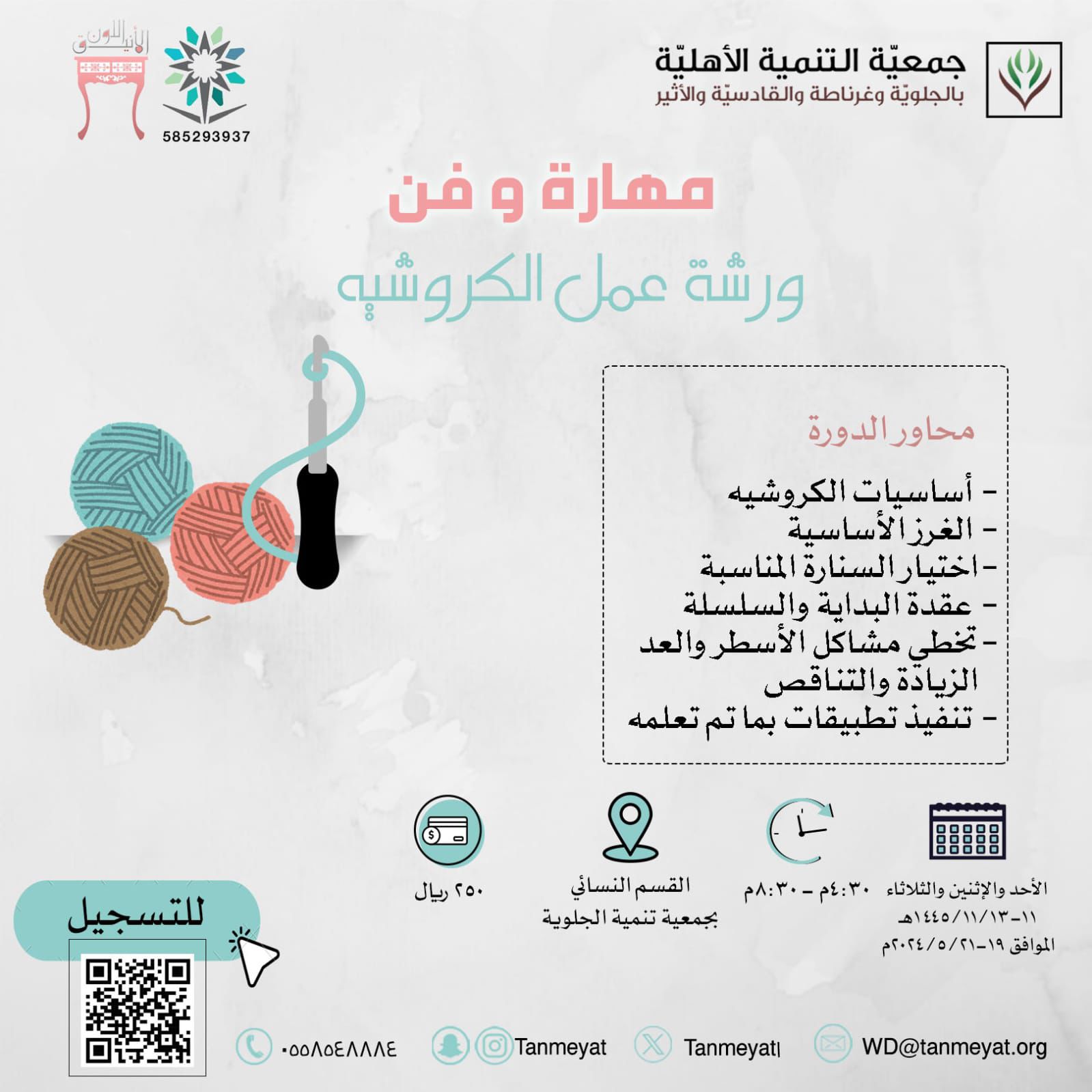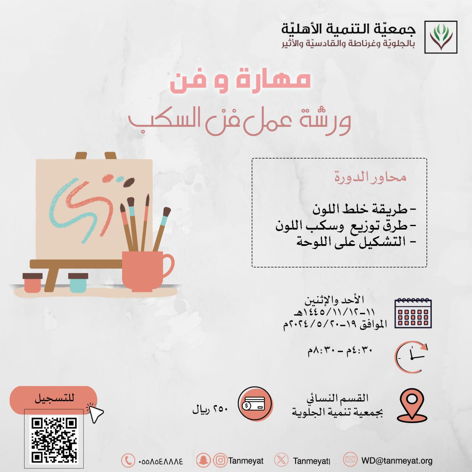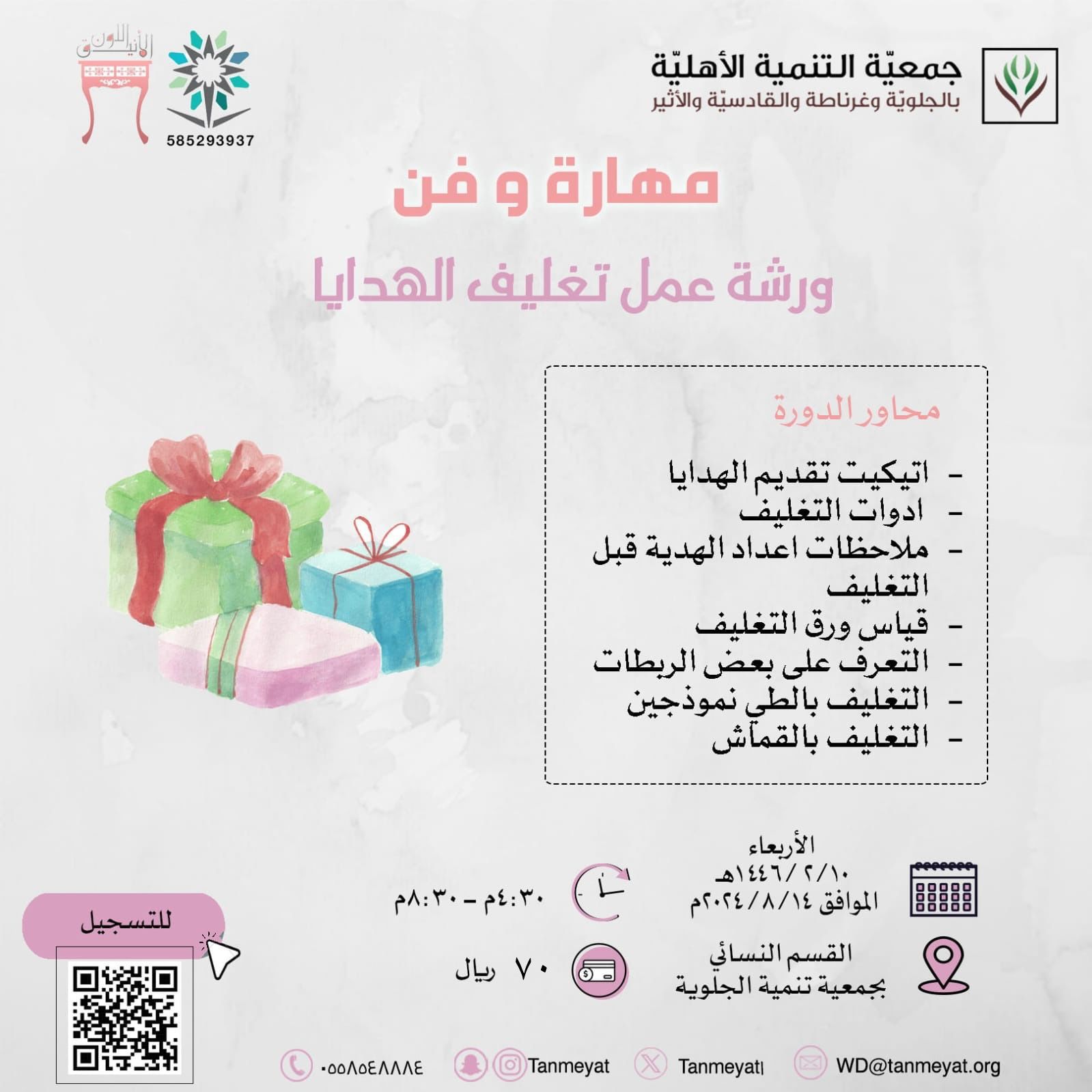 المكان : القسم النسائي لجمعية تنمية الجلوية بجوار جامع الإمام فيصل بن تركي | الرسوم : ٢٥٠ ريال