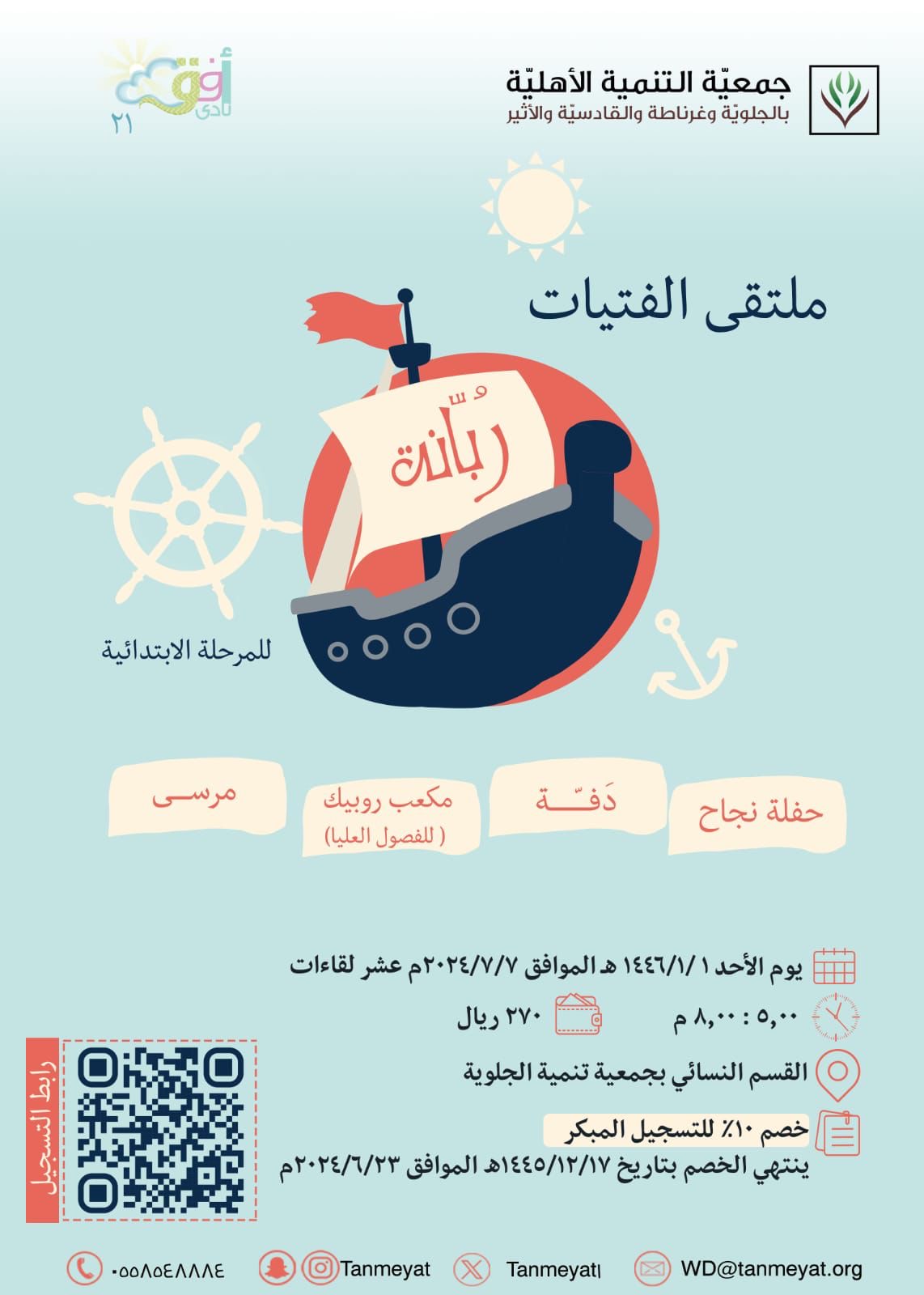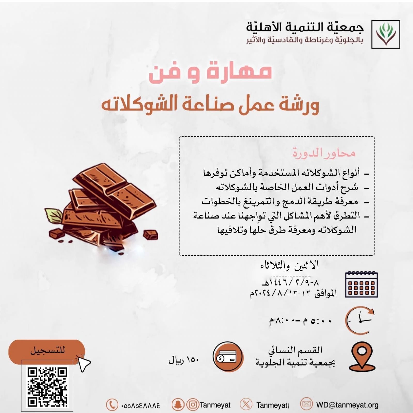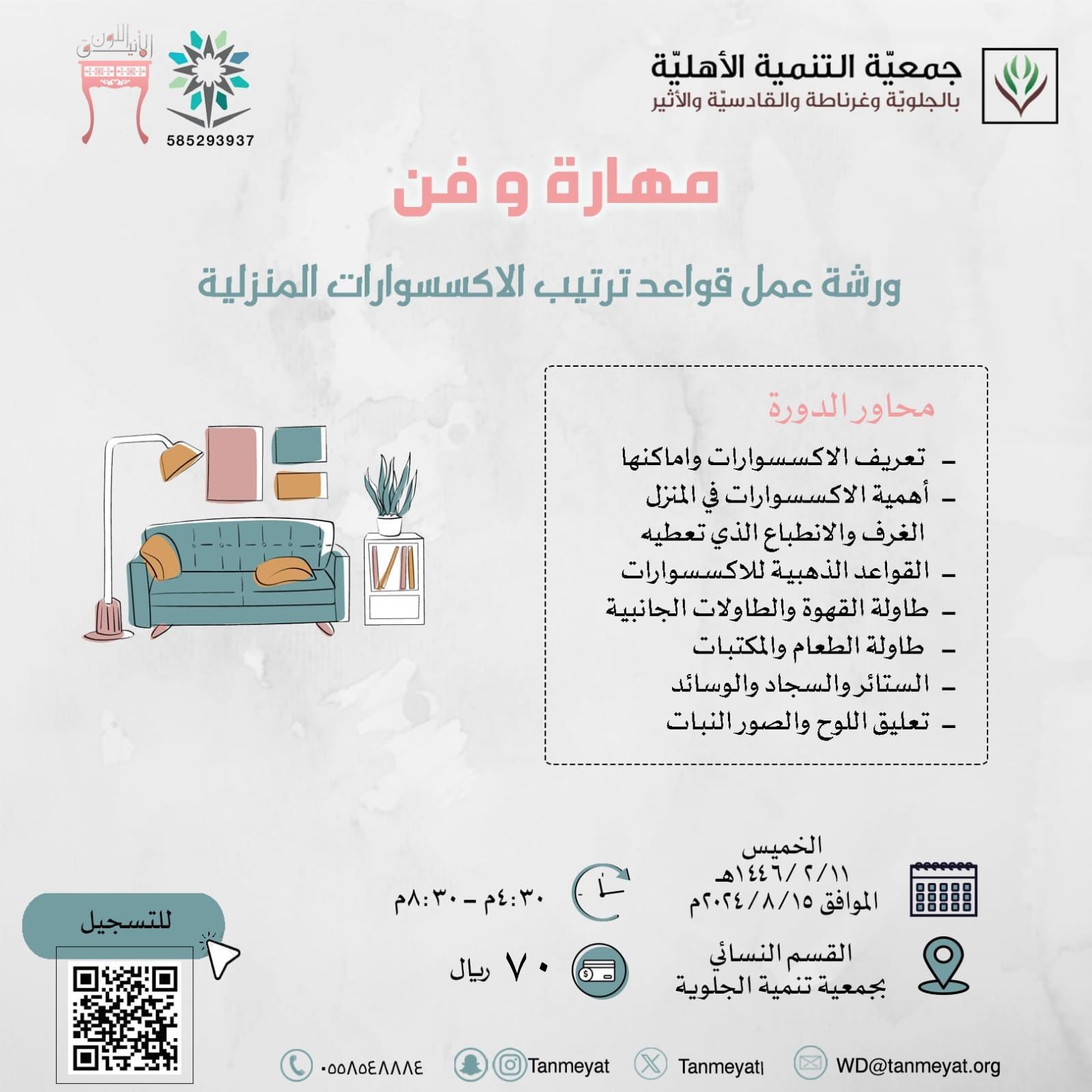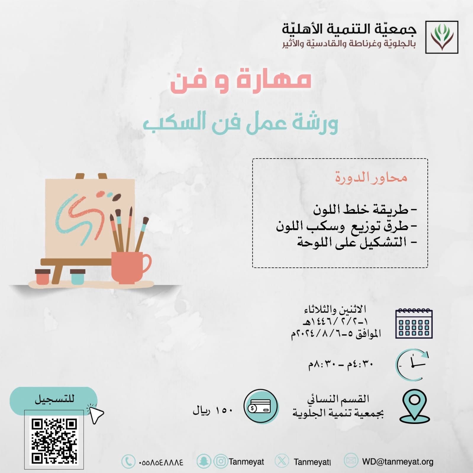 المكان : القسم النسائي لجمعية تنمية الجلوية بجوار جامع الإمام فيصل بن تركي | الرسوم : ٢٥٠ ريال