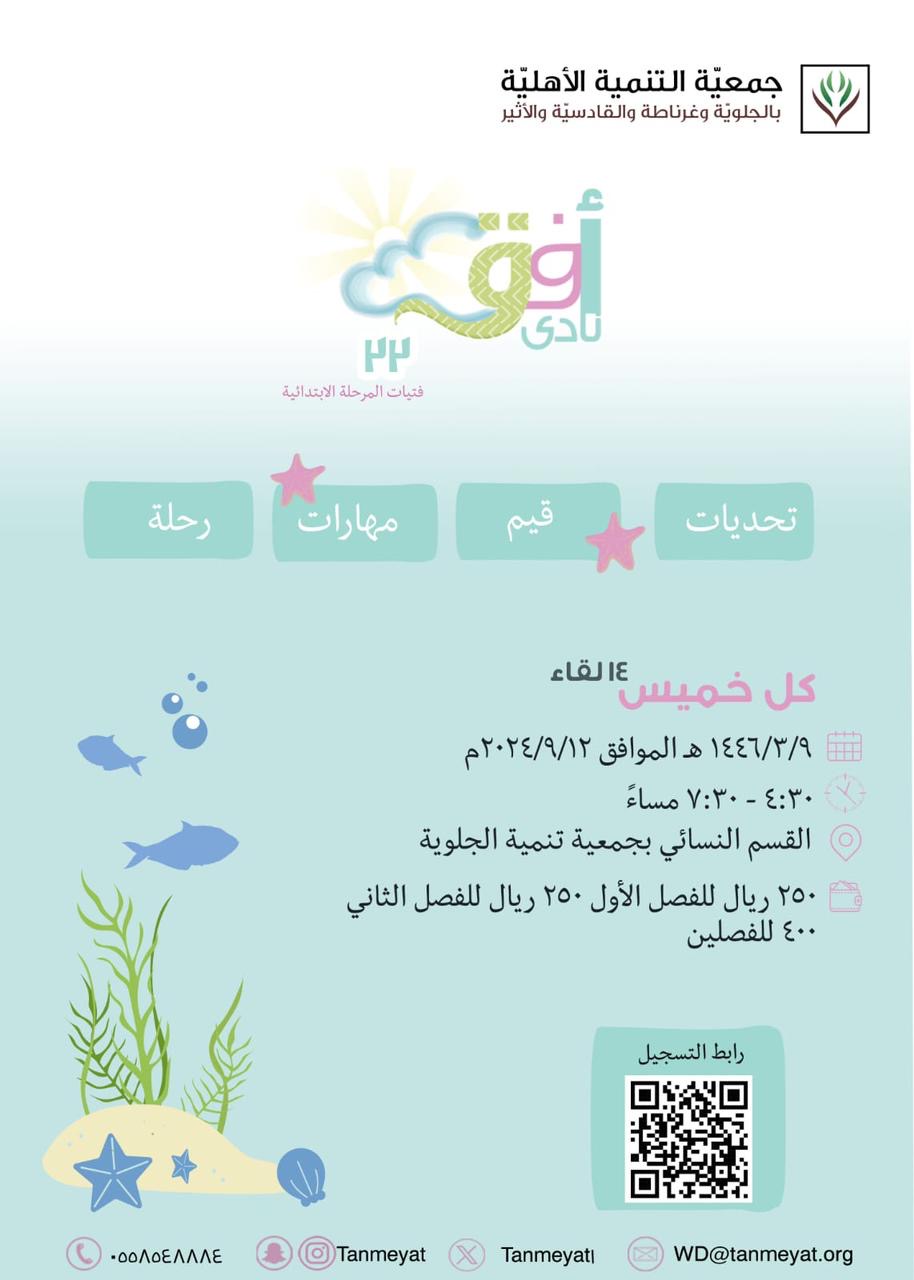 يسرّ *نادي أفق* التابع لجمعية تنميات الاجتماعية الأهلية بالجلوية وغرناطة والقادسية والأثير بالدمام أن يعلن عن الموسـ ٢٣ ـم